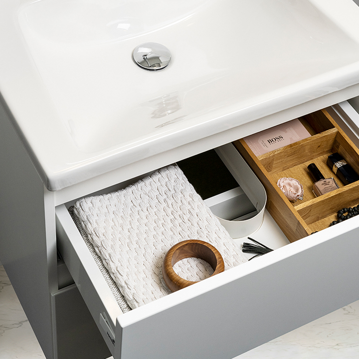 Himmel er et stilig servantskap med myk lukkende skuffer med integrerte håndtak. Skuffene kan trekkes helt ut og har metallkanter. En avtakbar matte i bunnen av skuffene holder ting på plass og gjør rengjøringen enklere. Den øverste skuffen har en U-formet design som gir plass til en vannlås. Skapet er forberedt for både gulv- og veggavløp og har justerbare monteringsbraketter. Tilgjengelig i matt hvit og antrasitt. Vannlås må kjøpes separat.