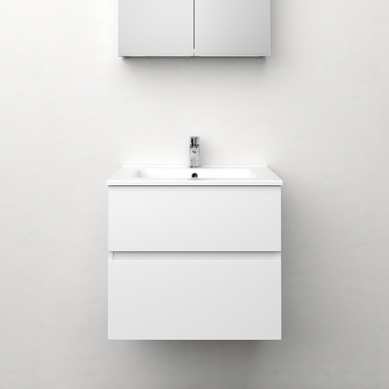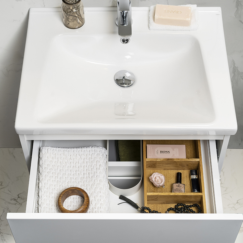 Himmel er et stilig servantskap med myk lukkende skuffer med integrerte håndtak. Skuffene kan trekkes helt ut og har metallkanter. En avtakbar matte i bunnen av skuffene holder ting på plass og gjør rengjøringen enklere. Den øverste skuffen har en U-formet design som gir plass til en vannlås. Skapet er forberedt for både gulv- og veggavløp og har justerbare monteringsbraketter. Tilgjengelig i matt hvit og antrasitt. Vannlås må kjøpes separat.