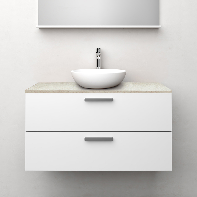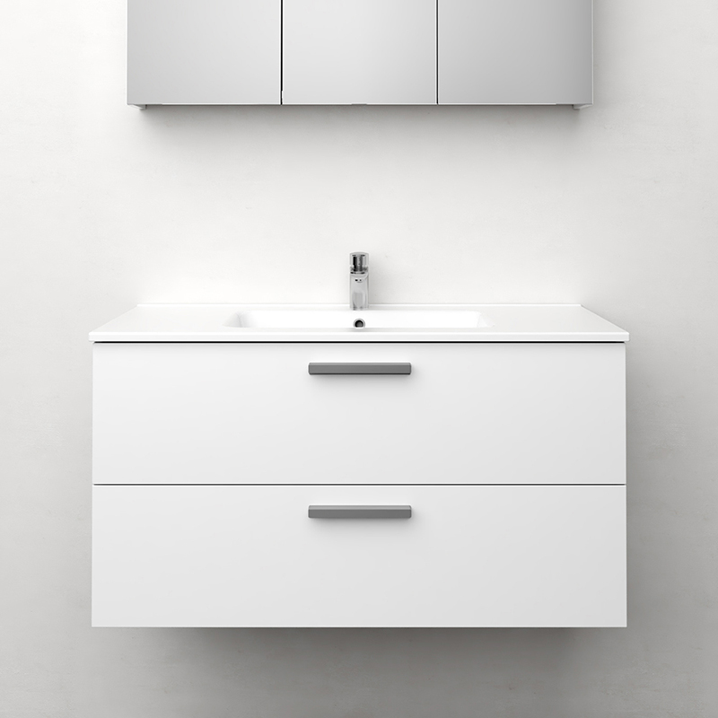 Myktlukkende skuffer med fullt uttrekk og skuffesider av metall. En uttakbar matte i bunnen på skuffene gjør at tingene ligger på plass og gjør det enklere ved rengjøring. Den øverste skuffen har en U-form som gir rom for vannlås. Møbelet er klargjort for både gulv- og veggavløp og har justerbare opphengsbeslag. Kjøp till håndtak.