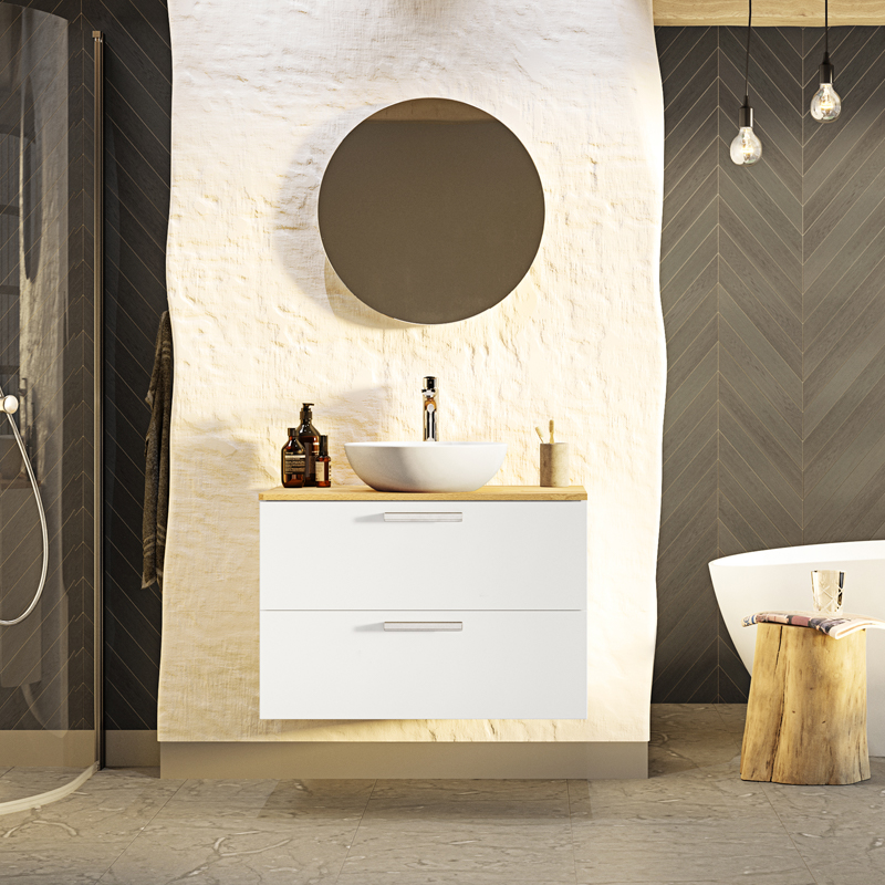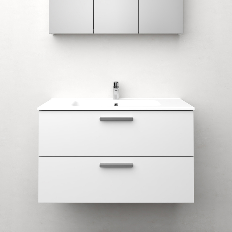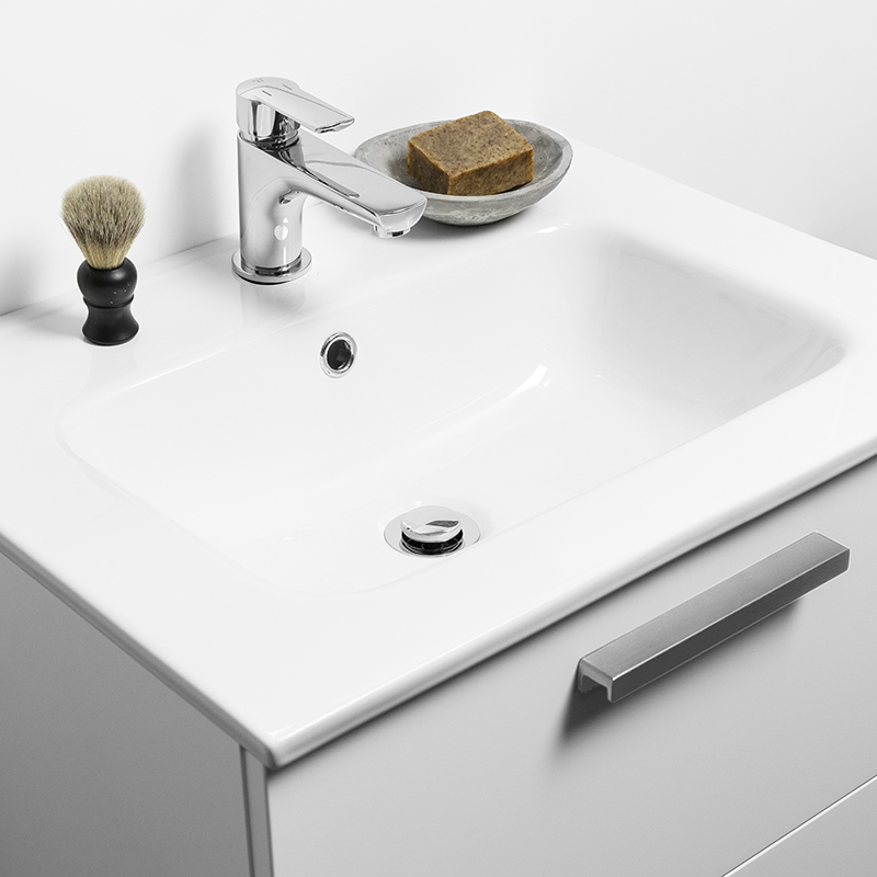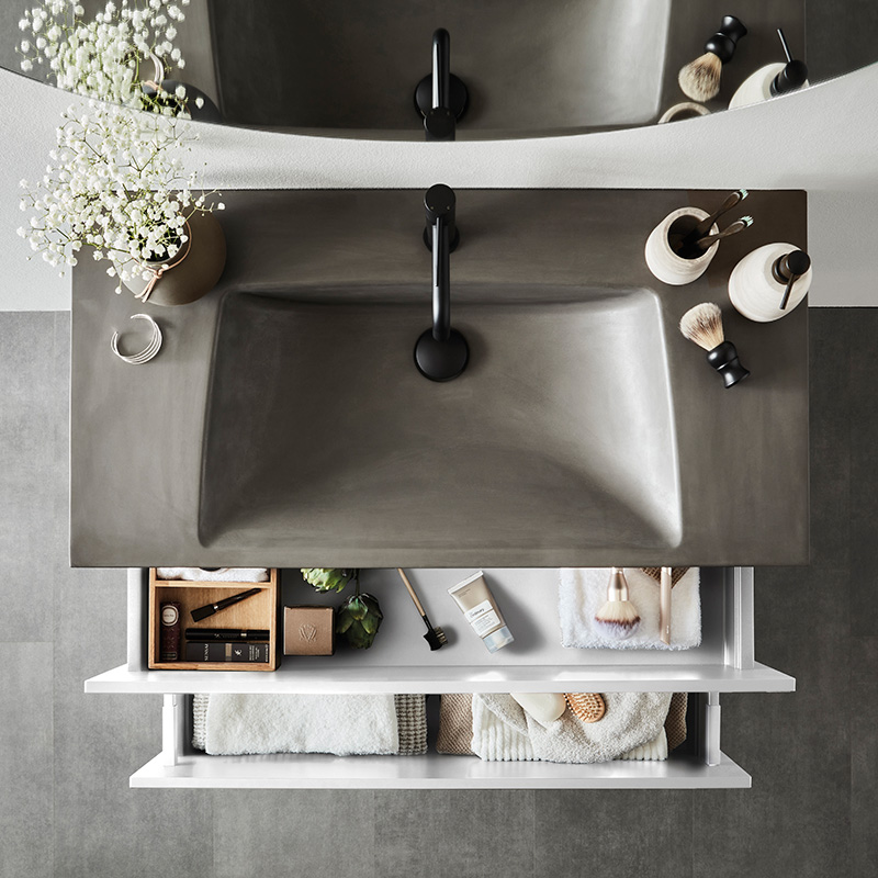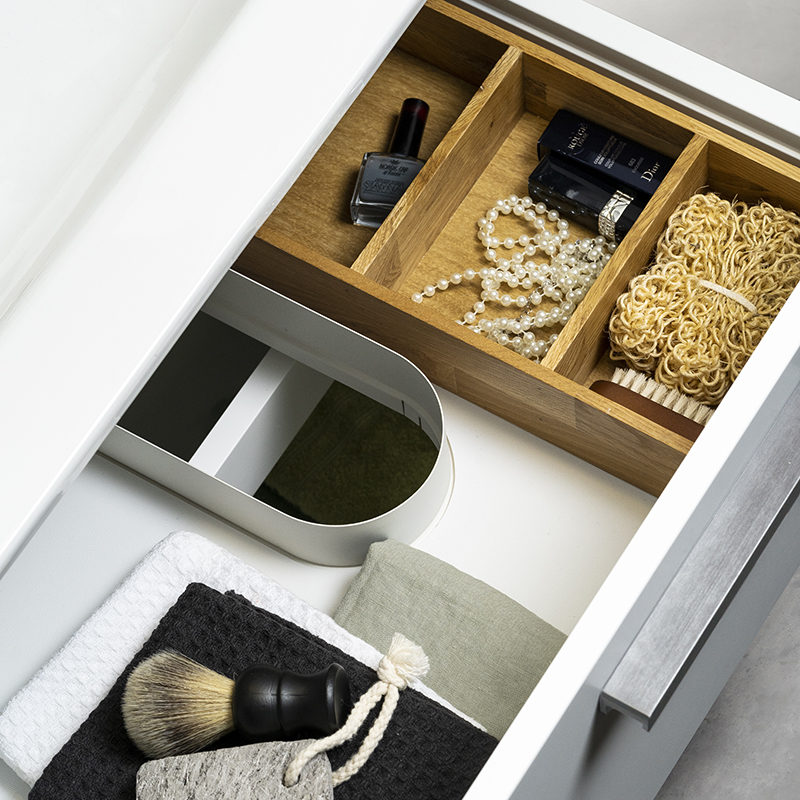Myktlukkende skuffer med fullt uttrekk og skuffesider av metall. En uttakbar matte i bunnen på skuffene gjør at tingene ligger på plass og gjør det enklere ved rengjøring. Den øverste skuffen har en U-form som gir rom for vannlås. Møbelet er klargjort for både gulv- og veggavløp og har justerbare opphengsbeslag. Kjøp till håndtak.
