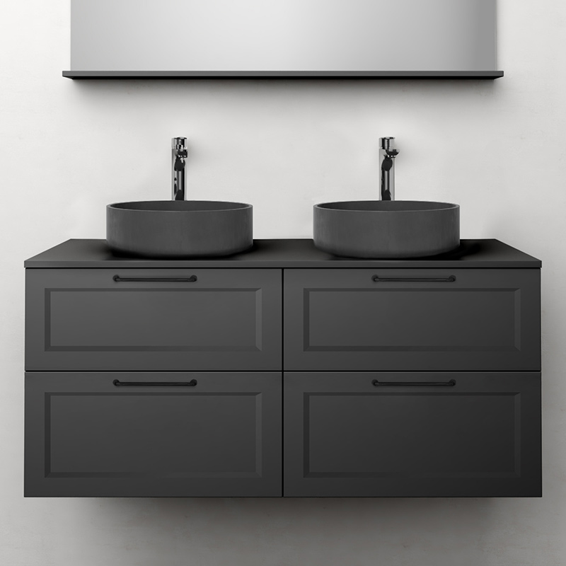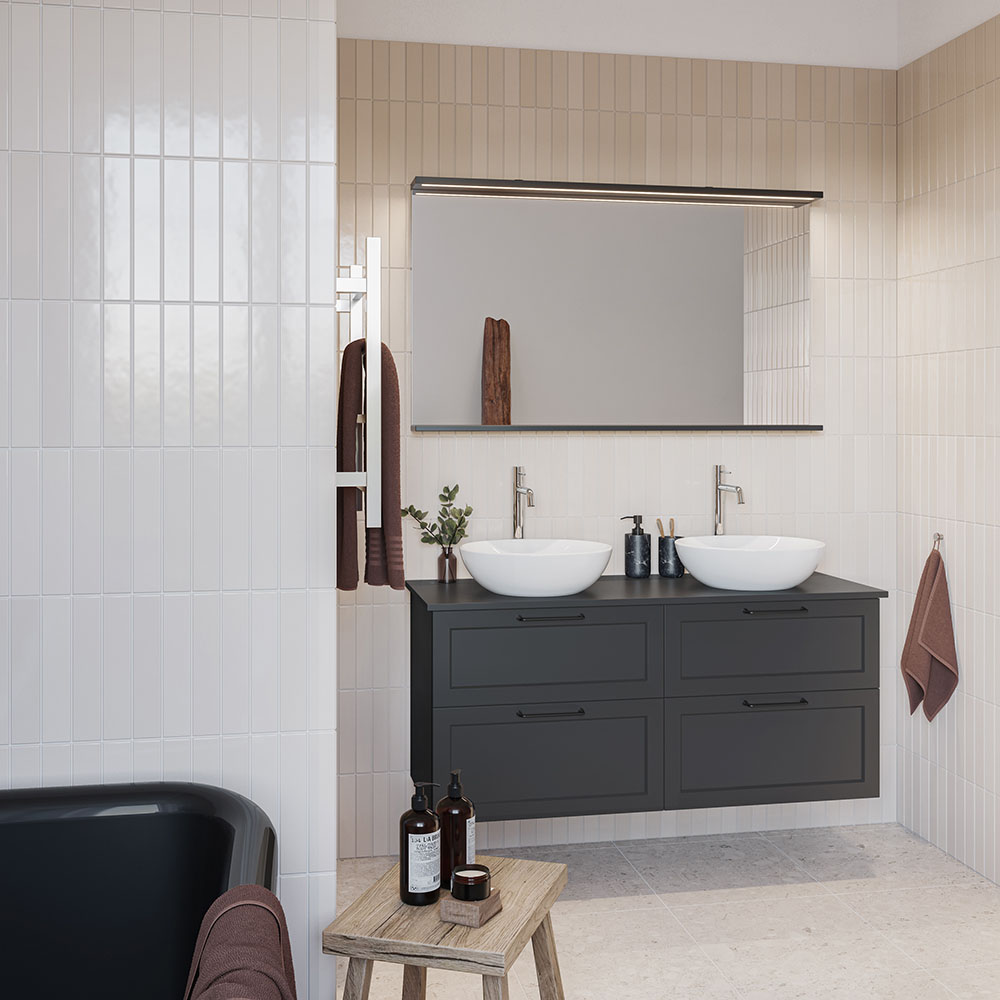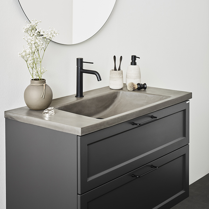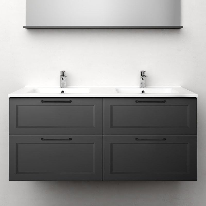 Nejd er et vakkert møbel i klassisk stil med rammefronter. Mykstengende skuffer med fulluttrekk og skuffesider av metal. En uttagbar matte i bunnen av skuffene holder ting på plass og gjør rengjøringen enklere. Den øverste skuffen har en U-konstruksjon som gir rom for vannlås. Møbelet er forberedt for både gulv- og veggavløp og har justerbare opphengsbeslag. Finnes i hvit matt og antrasitt. Vi anbefaler avløpssats 200 720 00 som tar liten plass i møbelet. Kjøp till håndtak.
