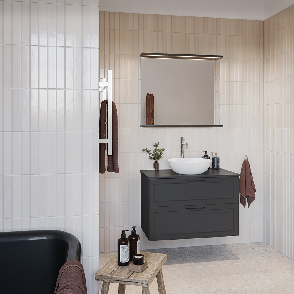 Nejd er et vakkert møbel i klassisk stil med rammefronter. Mykstengende skuffer med fulluttrekk og skuffesider av metal. En uttagbar matte i bunnen av skuffene holder ting på plass og gjør rengjøringen enklere. Den øverste skuffen har en U-konstruksjon som gir rom for vannlås. Møbelet er forberedt for både gulv- og veggavløp og har justerbare opphengsbeslag. Finnes i hvit matt og antrasitt. Vi anbefaler avløpssats 200 720 00 som tar liten plass i møbelet. Kjøp till håndtak.