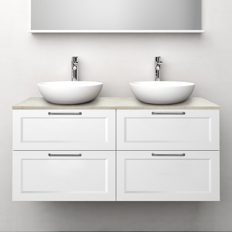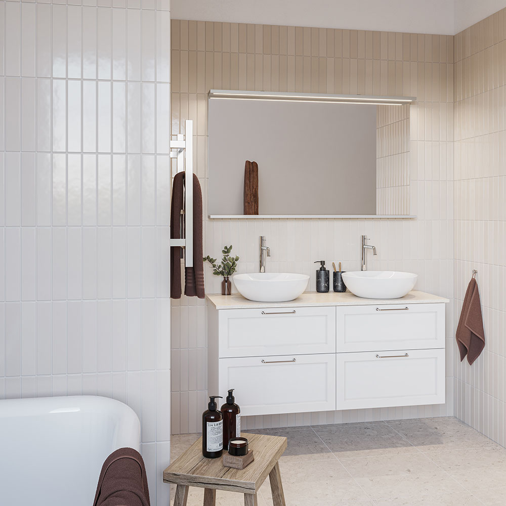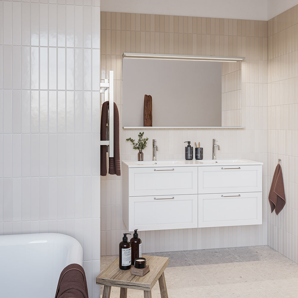 Nejd er et vakkert møbel i klassisk stil med rammefronter. Mykstengende skuffer med fulluttrekk og skuffesider av metal. En uttagbar matte i bunnen av skuffene holder ting på plass og gjør rengjøringen enklere. Den øverste skuffen har en U-konstruksjon som gir rom for vannlås. Møbelet er forberedt for både gulv- og veggavløp og har justerbare opphengsbeslag. Finnes i hvit matt og antrasitt. Vi anbefaler avløpssats 200 720 00 som tar liten plass i møbelet. Kjøp till håndtak.