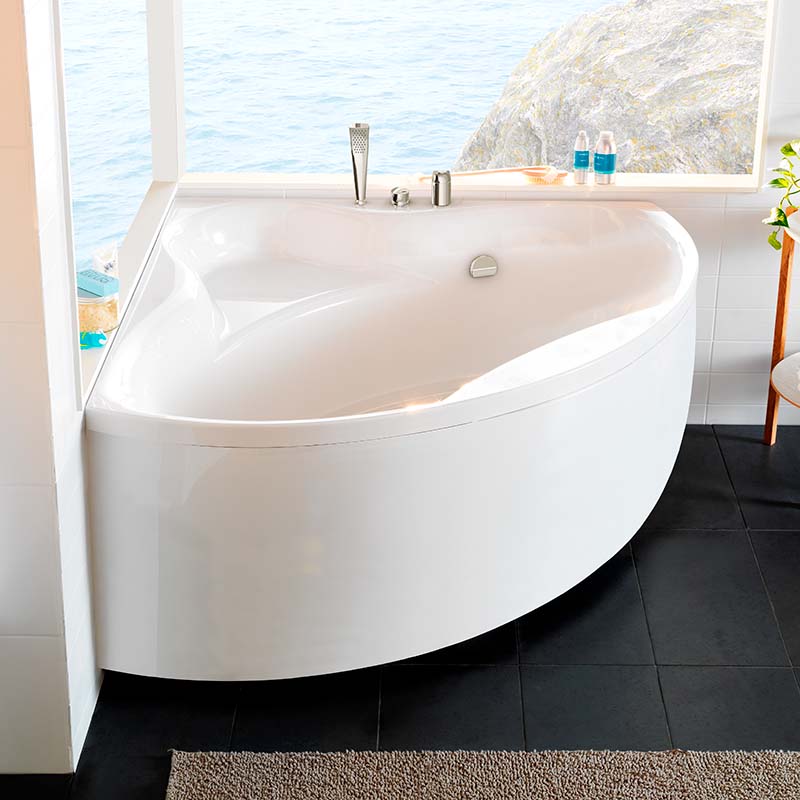 Komplett badekar uten system med front og Ocean badekarbatteri inkludert. Ocean hjørnebadekar er tilgjengelig i tre forskjellige størrelser. Både for det lille badet og for deg som har god plass og ønsker å kunne strekke deg ut. Felles for alle tre er at de har en praktisk sitte- og oppbevaringsplass i hjørnet.