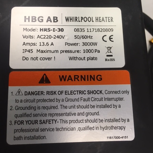 Underhållsvärmare till massagebadkar. 3 kw med termostat.