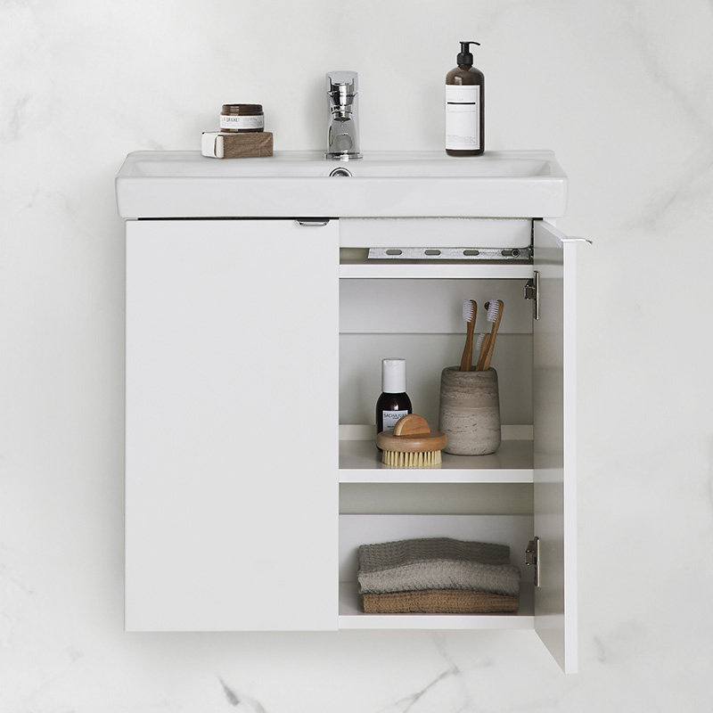 Vårt minste baderomsmøbel som passer perfekt i det lille gjestebaderommet. Til tross for de kompakte målene er kummen overraskende romslig. Du kan velge mellom dør eller skuffer, som begge er myktlukkende, som gir den riktige følelsen.
